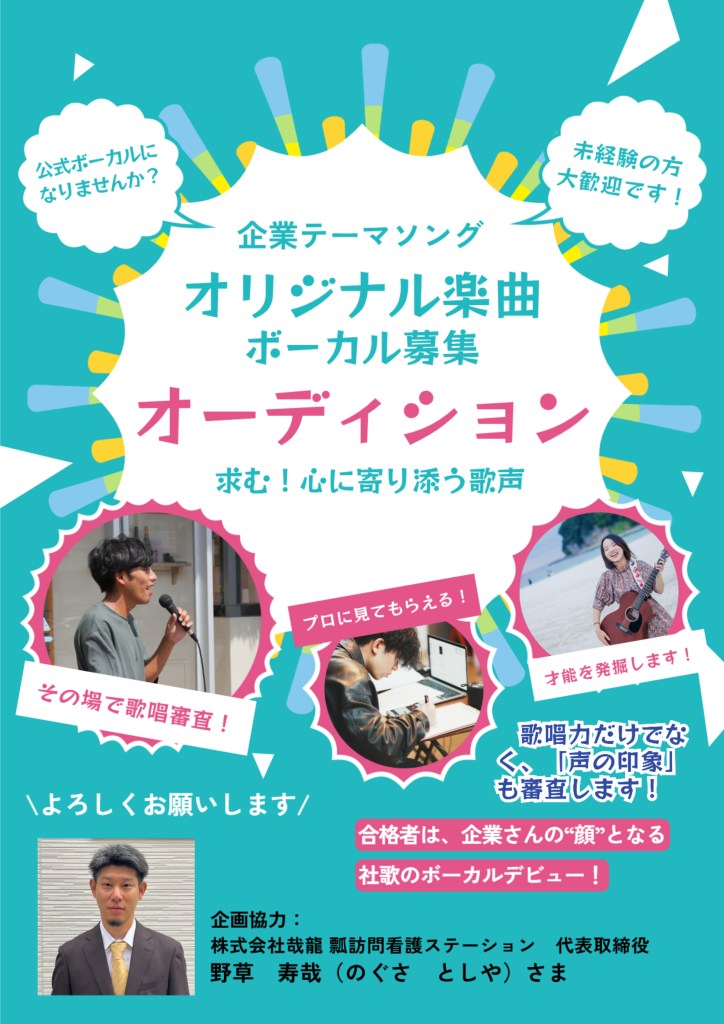 この度、企業のテーマソングとも言える社歌を新たに制作し、そのボーカルを務めていただける方を募集します。
